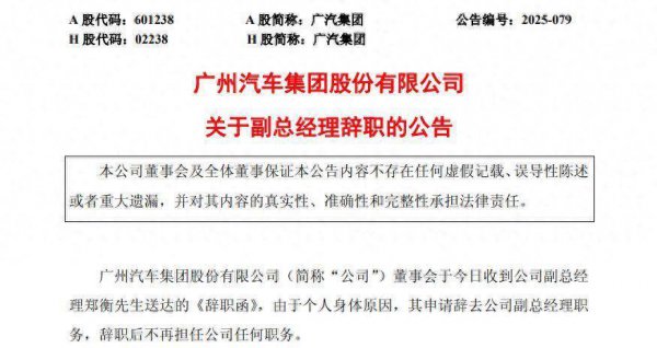 深圳商报·读创客户端记者 张弛 12月24日晚间,广汽集团(601238)公告,公司副总司理郑衡因个东说念主肉体原因,肯求辞去副总司理职务。 开头:公司公告 公 ...